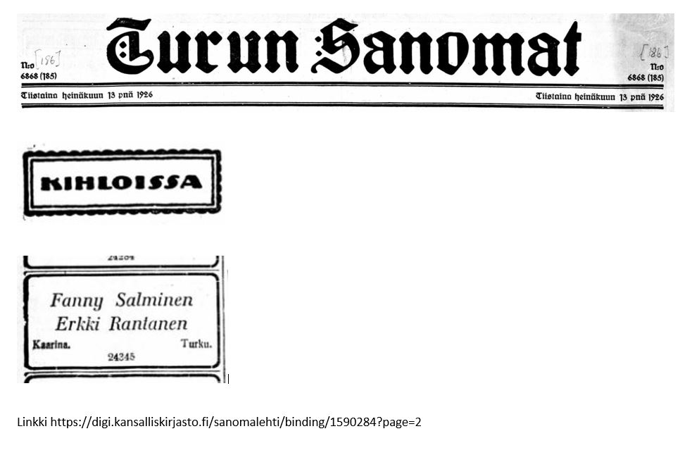- Fannyn ja Erkin kihlajaisilmoitus, TS 13.7.1926