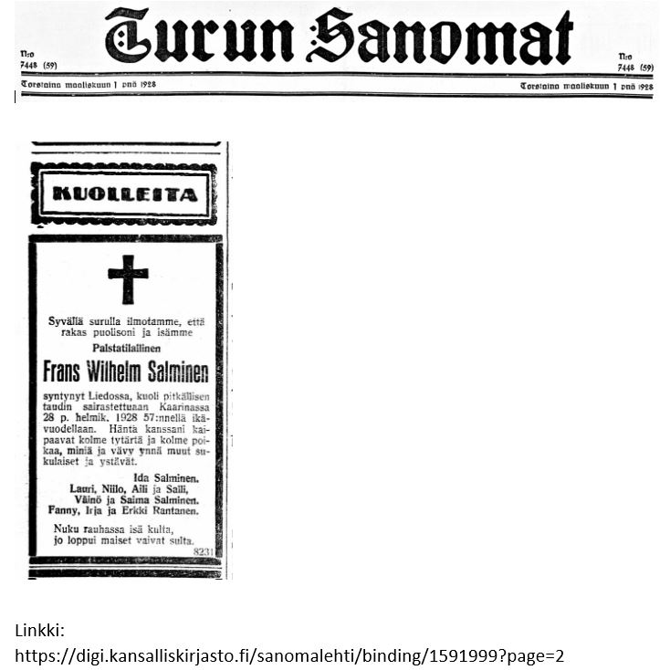 - Fannyn isän kuolinilmoitus, TS 1.3.1928, siitä selviää lisää nimiä Fannyn perheestä Kaarinassa ja Liedossa
